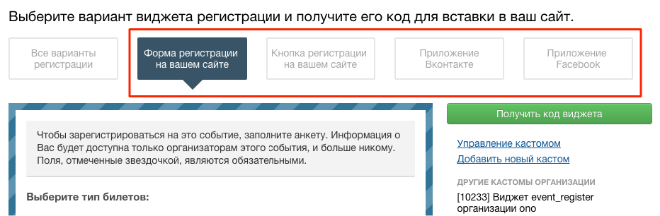 По нашей статистике, установка виджета регистрации на той странице, где вы рассказываете о своем событии, увеличивает конверсию в покупку билета более чем в два раза.
